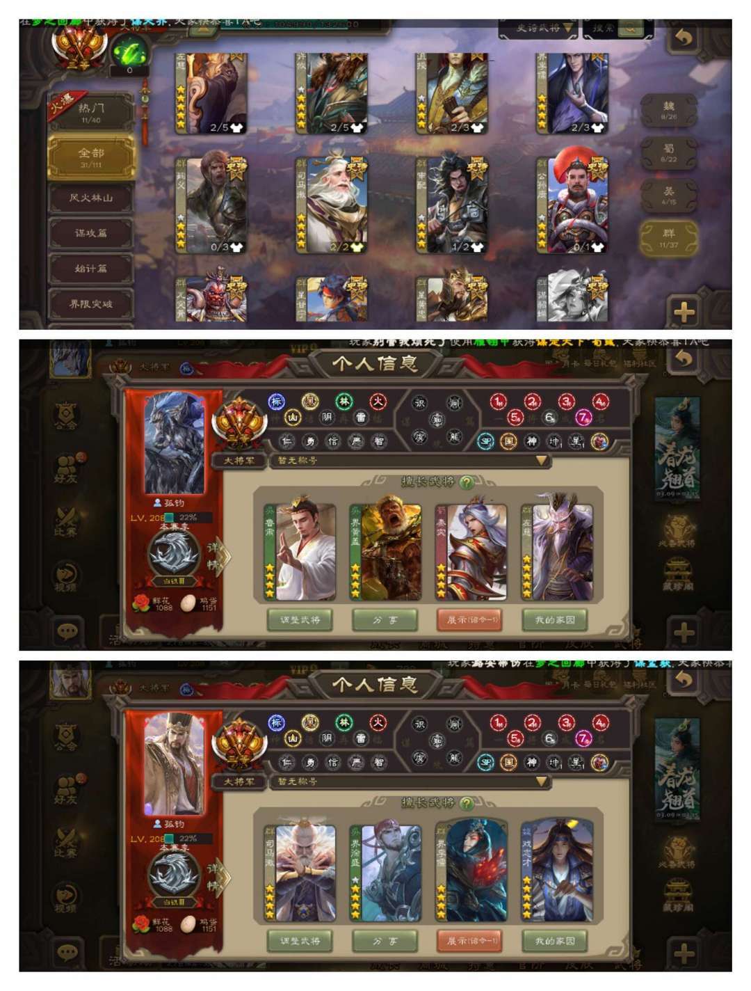 官方三等大将军,有卡,VIP9! 2五星炎龙:动戏志才动左慈! 17四星玉龙:回廊动界徐盛,动界李儒动许攸动关索动星甘宁动界朱然,金司马徽,神赵云! 35史诗武将,回廊动文鸯,动曹纯,界钟会聚义星黄忠等! 24动皮73金皮169国战皮肤!