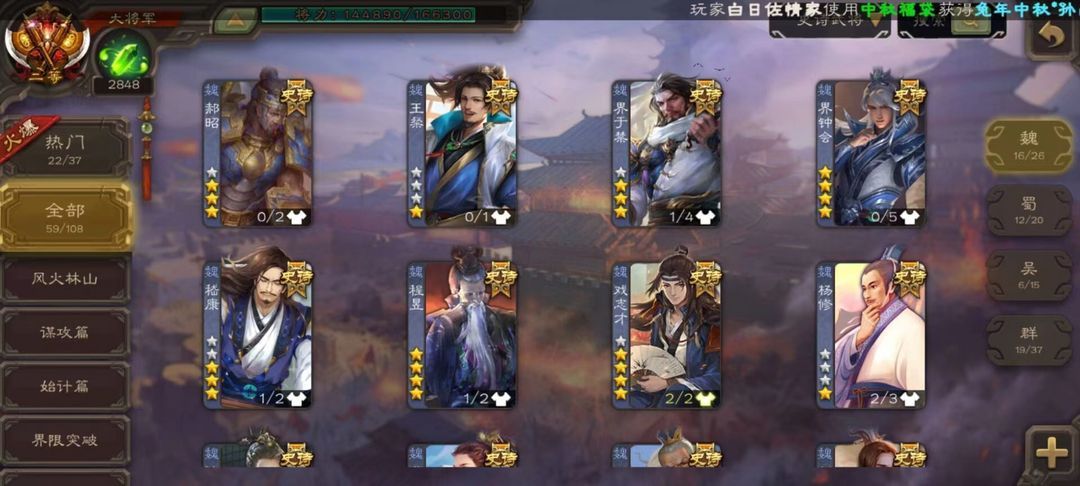 二等大将军★炎龙动刘焉★炎龙动神甘宁★炎龙动徐荣60史诗动神赵云动戏志才界钟会马钧界徐盛祢衡
