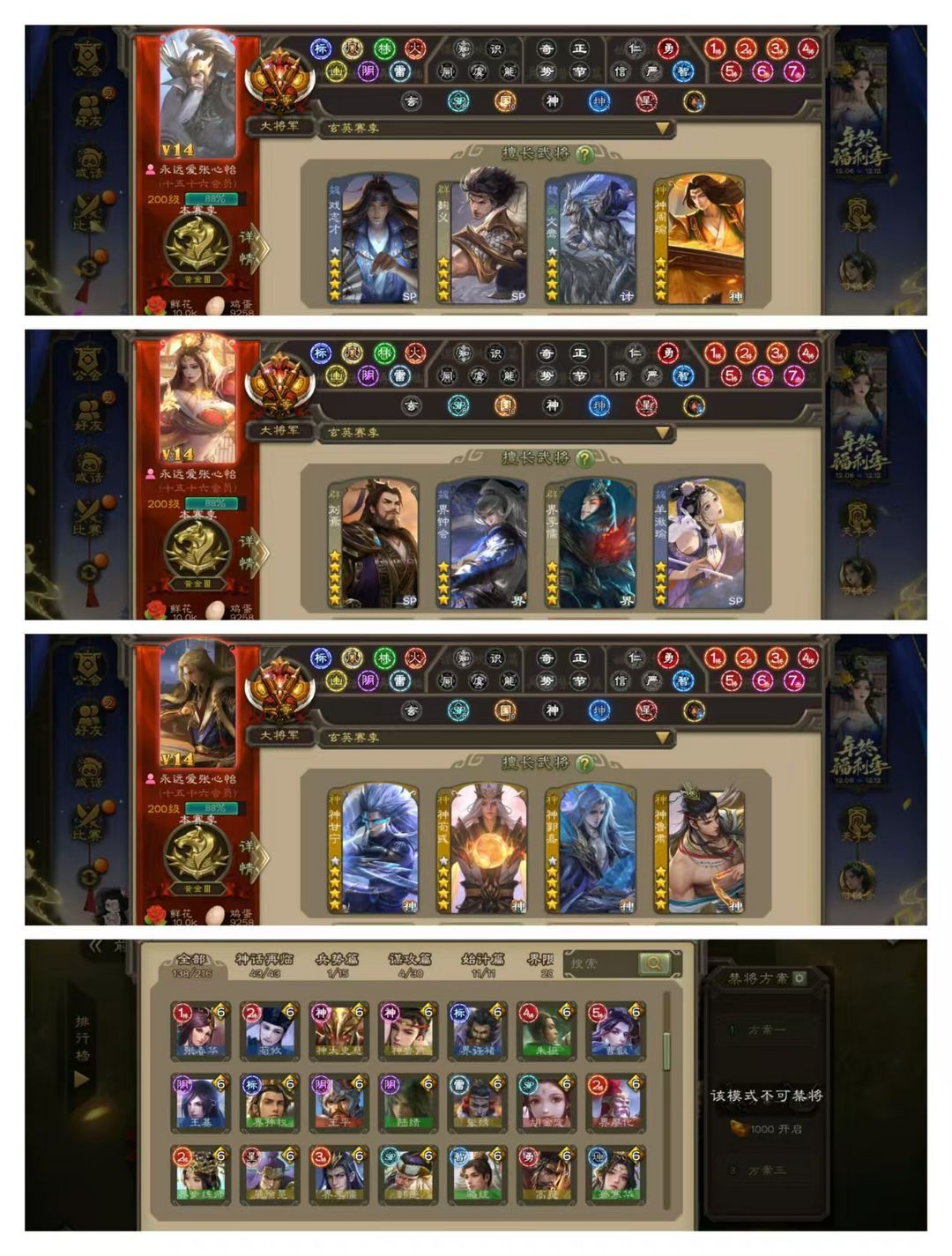 官方一等大将军,有卡,VIP14! 18四星玉龙:回廊双形态动神郭嘉,回廊动神荀彧,动刘焉动神甘宁动羊徽瑜动界李儒,金聚义,神鲁肃神陆逊马钧! 79史诗武将,回廊双形态动界钟会,回廊动文鸯,回廊动神孙策,回廊动谋黄忠,奇门动孙寒华,冠绝天下动神吕布,动谋黄盖动界左慈动神赵云动戏志才动许攸,金杨彪金王元姬,友诸葛亮界沮授杜预星甘宁界徐盛,皇甫嵩周群南华老仙等! 80动皮180金皮240国战皮肤!