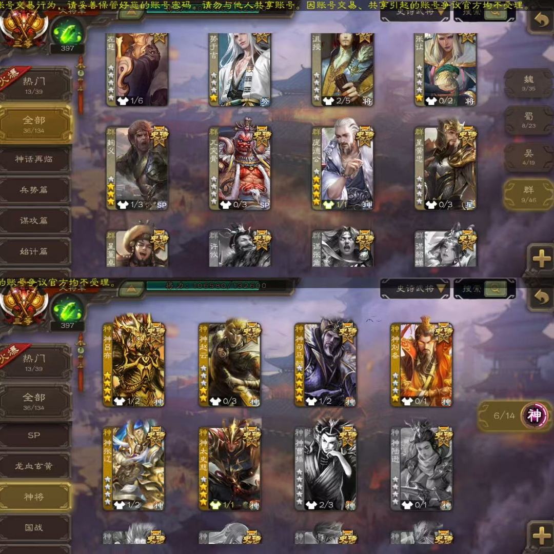 重点必看:更多优质号请去店铺查看~请不要改名、逃跑、乱用道具、恶意毁号.恶意撤单之类的行为,一经发现永久拉黑。 游卡官方,安卓苹果通用。36史诗大将军 曹髦 动态谋关羽 势太史慈 界徐盛 势于吉 麹义 动态神司马懿 动态神太史慈 动态界钟会 戏志才 谋夏侯惇