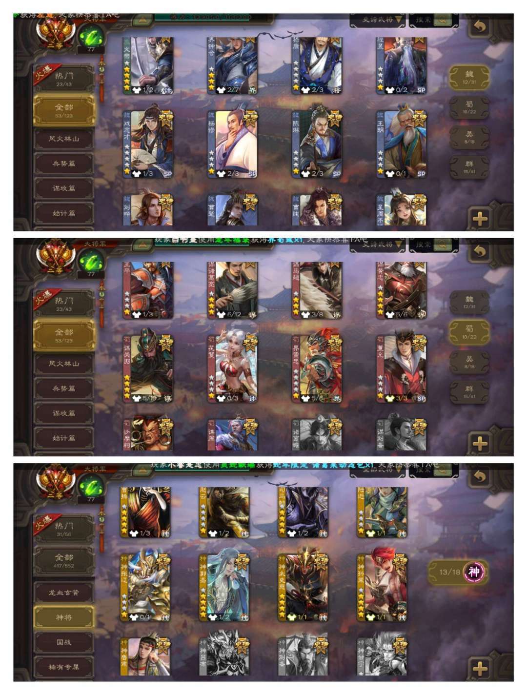 官方二等大将军,有卡,VIP13! 13四星玉龙:回廊双形态至臻动文鸯,回廊动神曹操,回廊动神孙策,回廊动神太史慈,回廊动孙寒华,回廊动谋黄忠,回廊动杜预,回廊动谋黄盖,动神郭嘉动神司马懿动谋关羽动谋陆逊,曹髦! 53史诗武将:回廊动界李儒,回廊动沙摩柯,回廊动星黄忠,动谋诸葛亮动界钟会动神陆逊动星周不疑,金神赵云金界徐盛金郑玄,张奋十常侍神鲁肃张仲景戏志才留赞祢衡,鲍信阎象谋大乔谋小乔成济张绣! 36动皮105金皮200国战皮肤!