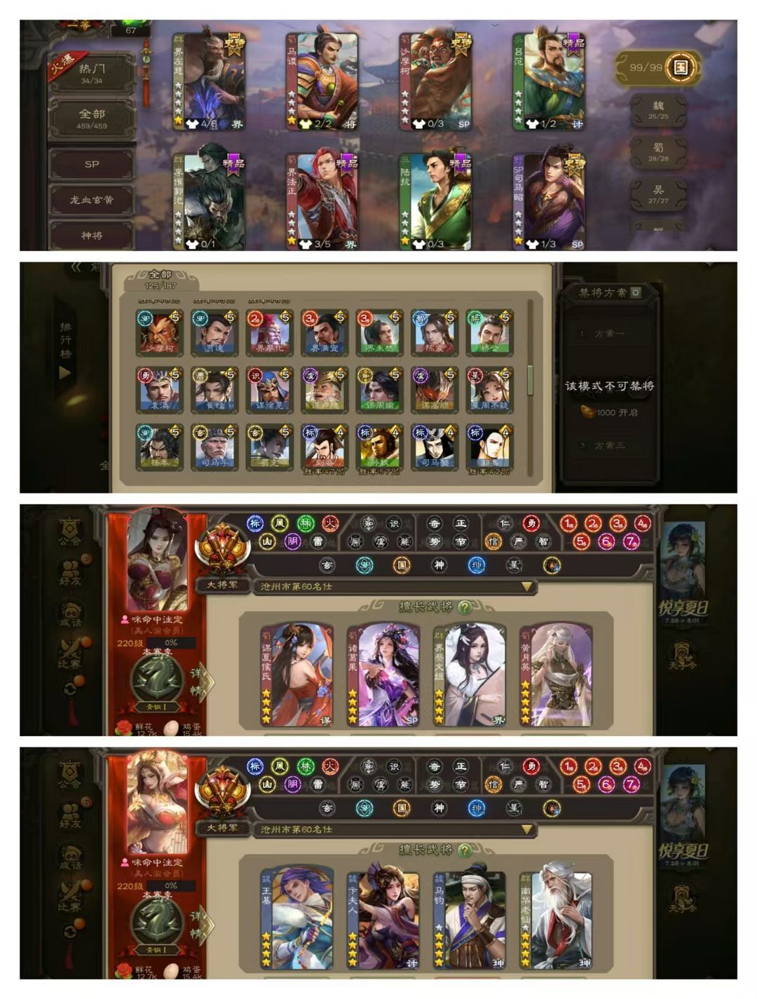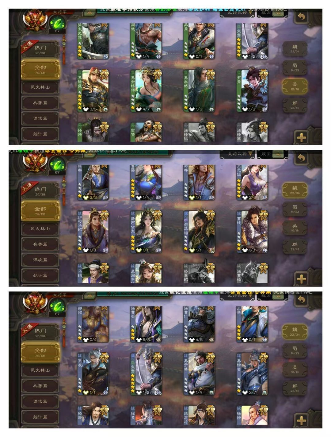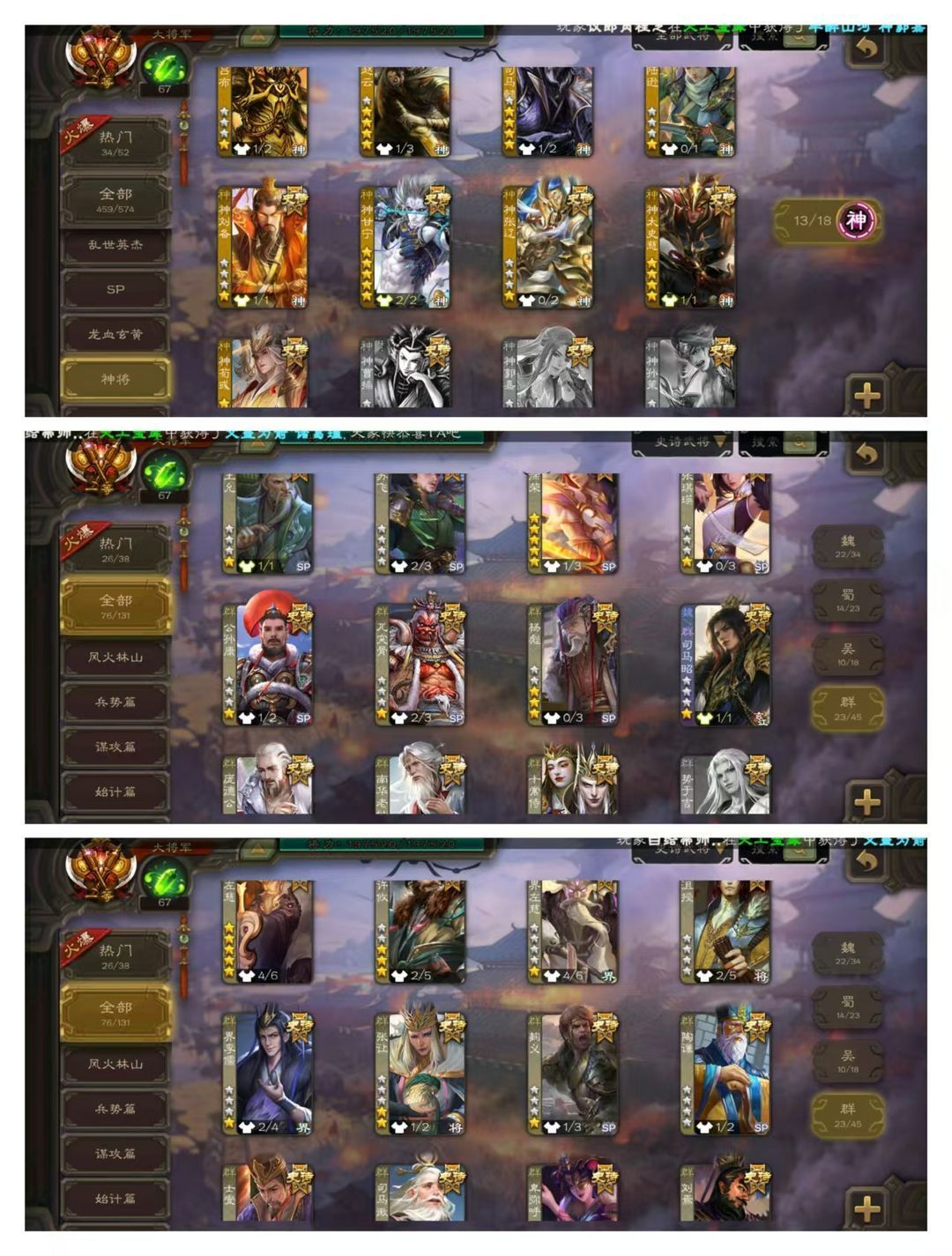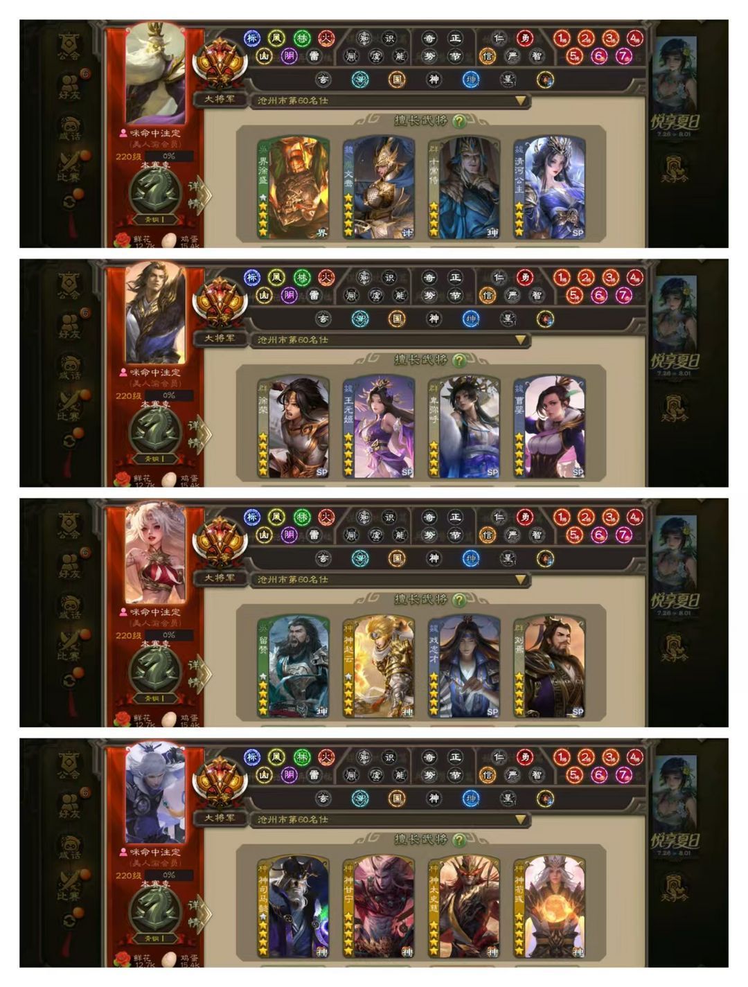 官方一等大将军,有卡,VIP15! 10五星炎龙:回廊双形态至臻动文鸯,回廊动神甘宁,回廊动神荀彧,回廊动王元姬,动刘焉动徐荣动曹婴动戏志才! 17四星玉龙:回廊双形态至臻动十常侍,回廊动界徐盛,回廊动神太史慈,回廊动卑弥呼,动神司马懿动清河公主动留赞动神赵云动谋夏侯氏,马钧南华老仙王璨! 76史诗武将:动谋曹丕动司马昭动界左慈动界钟会动花鬘,金谋曹仁金鲍信金界李儒金张让,势太史慈杨彪神陆逊张琪瑛,阎象友徐庶司马孚! 125排位武将100国战武将,107动皮195金皮245国战皮肤!