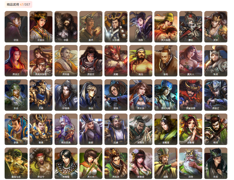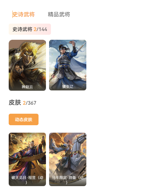 史诗武将,2动皮,武将:神赵云,骥张辽,乐进,朱灵,文聘,SP姜维,钟会,郭淮,界王异,界司马懿,界夏侯惇,界张辽,李典,曹真,韩浩史涣,陈群,吕虔,伏完,伏皇后,华雄,袁术,公孙瓒,诸葛瑾,孙鲁育,韩当,潘璋马忠,界甘宁,界周瑜,界大乔,界陆逊,孙鲁班,顾雍,吕岱,许贡,界韩当,谋韩当,张布,马良,关兴张苞,廖化,关平,界法正,界关兴张苞,界刘备,界赵云,吴懿,周仓,张松,糜夫人
