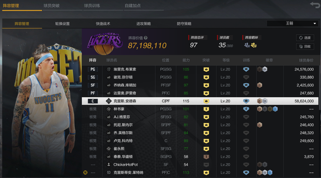 【满突09克里斯安德森】大花臂鸟人安德森,带满突血布王朝阵容 可以打排位赛,街头段位:当家球星,王朝段位:职篮新秀 信誉分:100,更新时间:2.19 请勿消极游戏、强退游戏等扣罚信誉分行为,最后几分钟可以开一把自定义,谢谢理解